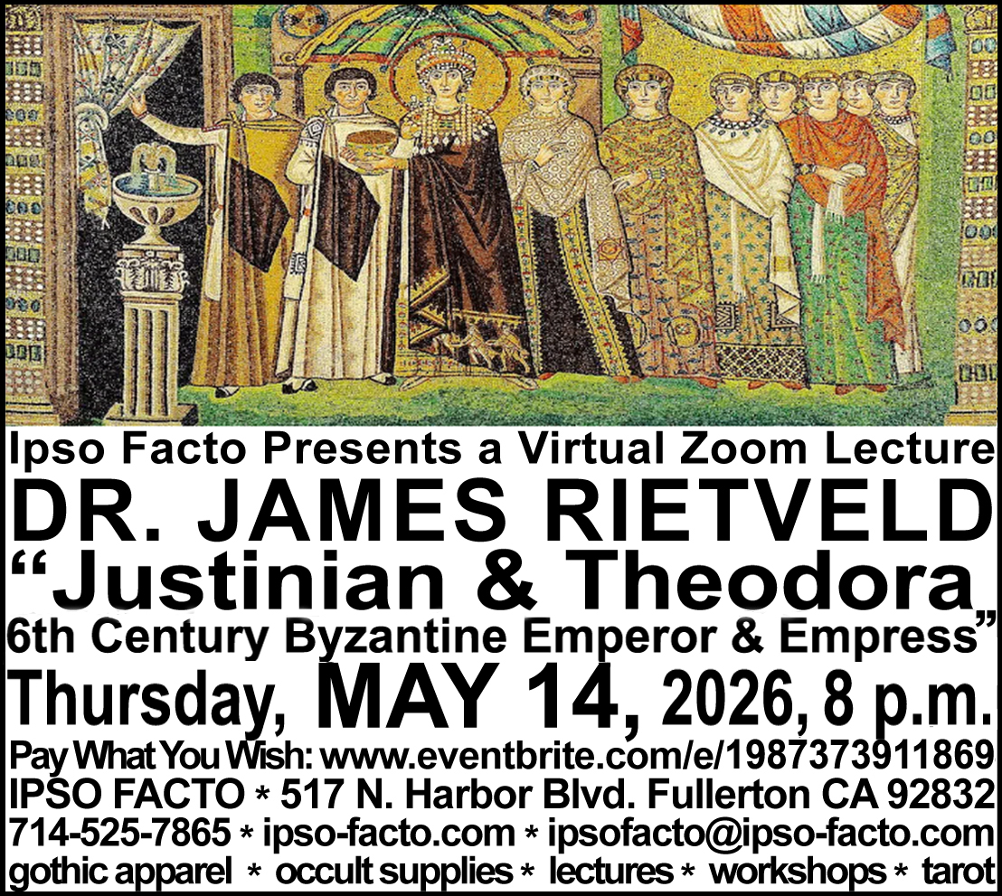 Thursday, July 28, 2022, 8:00 p.m. on Zoom "Apollonius of Tyana" Thursday, August 11, 2022, 8 p.m. Facebook event listing Pay What You Wish/Donation Tickets on Eventbrite. Flyer Watch this Lecture on You Tube Synopsis: Join us at Ipso Facto for a fascinating and controversial lecture "Apollonius of Tyana" on Wednesday, July 28, 8 p.m. with Cal State Fullerton professor Dr. James Rietveld. Apollonius of Tyana was a charismatic teacher, healer, neo-Pythagorean philosopher, traveler, ascetic vegetarian, mystic and miracle worker of the first century, a "divine man" born 15 c. 100 AD in Tyana in the province of Cappadocia in Anatolia. Often compared to Jesus (and apostle Paul) for many striking correlations in their lives, Apollonius is not mentioned in the Bible, but his story has many sources including Athenian sophist, Philostratus', commissioned work "Life of Apollonius" (210 CE), Moeragenes' "Memorabilia of Apollonius of Tyana, magician and Philosopher," the memoirs of disciple Damis of Nineveh, Apollonius' own letters and books, plus the local traditions of the cities of Ephesus, Tyana and Antioch. Beginning with a miraculous birth, the sage of Tyana became an unusually precocious young man who went on an itinerant preaching ministry, urging others to not live for the material world, but rather for what is spiritual. Apollonius was a teacher of asceticism with an understanding of mathematics and philosophy, who also performed miracles as mystic and magician, casting out demons, healing the sick, and receiving direct revelations from the gods. It is said that he saw a vision of the death of Emperor Domitian as it occurred, and gave warning to citizens of Ephesus of an impending plague, which went unheeded until pestilence struck. Thenceforth, they sought further advice of the man they thought to be a mighty and prophetic magician. Apollonius also reportedly resurrected the deceased daughter of a Roman consul, and rescued a former student, Menippus of Corinth, from a terrible fate on his wedding night, by making the wedding banquet and some guests disappear, revealing them to be illusions of the evil vampire bride, who promptly confessed. The mystery surrounding Apollonius' death has several versions including ascending to heaven while on trial for "magic" before Emperor Severus, and mysteriously vanishing from the temple of Dictynna. Apollonius' legacy continued to unfold as a hero of Pagan culture in late Antiquity, and was influencial to medieval Islamic alchemist Jabir ibn Hayyan, whose "Book of Stones" attributed analyses of alchemical works to him. European advocates of Enlightenment saw him as an early proponent of a universal, non-denominational religion compatible with Reason. Later admirers include radical English deist, Charles Blount, Voltaire, the Marquis de Sade, Theosophists C.W. Leadbeater, Alice A. Bailey, and Benjamin Creme, Madame Helena Blavatsky, and Ezra Pound. Variously called an Ascended Master, one who taught the same "high moral truths as Jesus," Apollonius's existence is perhaps more provable than his contemporary, Jesus, whose story, some say, was inspired by Apollonius'. If this sounds interesting, then you won't want to miss this lecture on Thursday, July 28, 8 p.m |