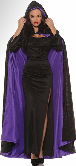 28083 - Deluxe black velvet with purple satin flocked lining hooded cape. One size. $47.00