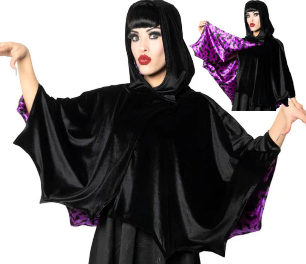 gscbwvb -Kreepsville bat wing black velvet short hooded cape with purple bat lining. $49.50