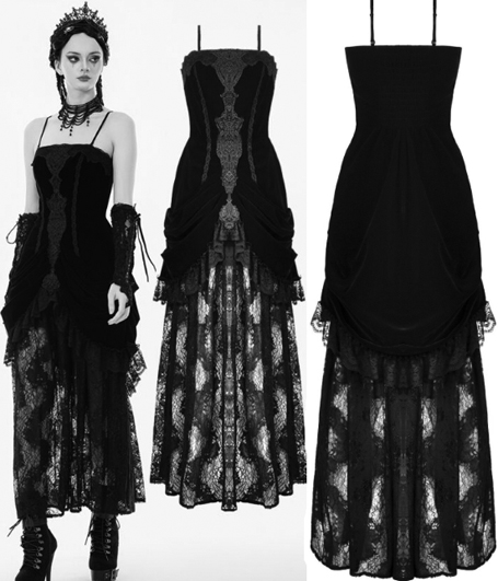 dw1055 -Dark in Love gothic black lace velvet ruffle overlay long dress. Medium $121.50.