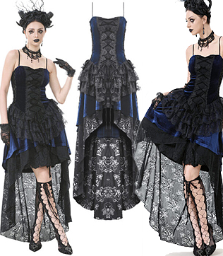 dw1113 -Dark in Love long indigo blue stretch velvet/black lace gothic high low dress. $121.50
