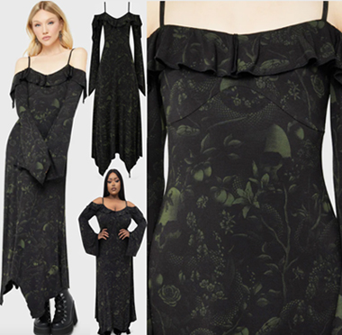 ksra012985- Killstar Eden's Venom long stretch viscose flared sleeve ruffle front dress. Medium $68.00