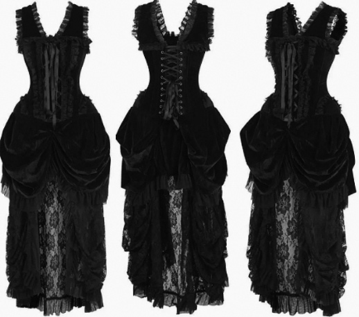 td443- Daisy Top Drawer steel bonned black velvet Victorian bustle corset dress. Medium $161.50