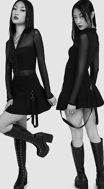 ksra005089-Killstar black stretch mesh Yasumi mini skirt with suspender straps, built in shorts, wide waistband. $55.50.