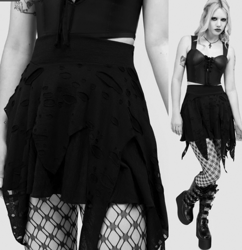 ksra012637-Killstar Hollow Grove black disctressed poly hanky hem elastic waist skirt. $54.50