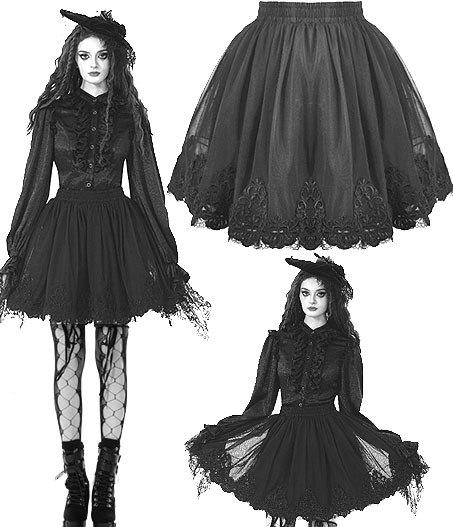 kw259-Dark in Love short Rebel Doll layered a-line mini skirt with textured jersey knit fabric, mesh underlayer, hanky hemline. Medium. $84.00.