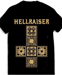 HELLRAISRCRS - Hellraiser Cube Cross mens' unisex black t-shirt with gold ink. S-XL $17.50 See pull down menu for sizes in stock.