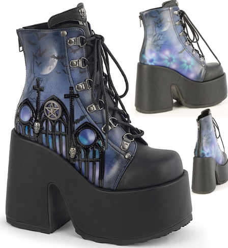 cam203pt - Pleaser/Demonia black patent lace up 5 inch chunky heel platform women's Camel ankle boot with back zip, painted cemetery scene. Womens 8 $125.00