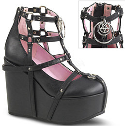 Poison107 - Black vegan pu Pleaser/Demonia 5 inch wedge platform Poison ankle boot with straps, studs, charms, chain. $123.50